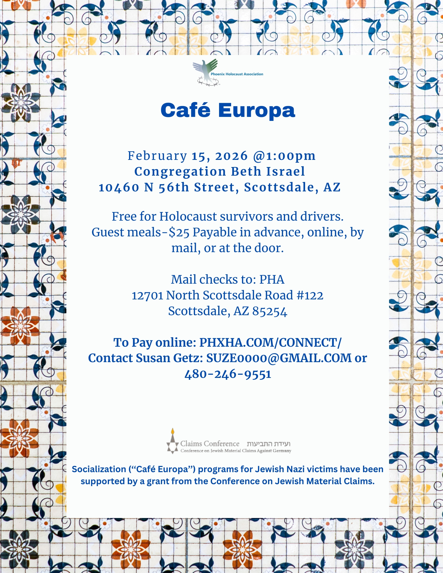To Pay online: https://phoenixholocaustassociation.app.neoncrm.com/np/clients/phoenixholocaustassociation/event.jsp?event=226& Contact Susan Getz: SUZE0000@GMAIL.COM or 480-246-9551 RSVP with Susan by Wednesday, January 7th. January 11, 2026 @ 1:00 PM Congregation Beth Israel 10460 N 56th St, Scottsdale, AZ Free for Holocaust survivors and drivers. Guest meals $25 Payable in advance, online, by mail or at the door. Mail checks to: PHA, 12701 North Scottsdale Road #122 Scottsdale, AZ 85254